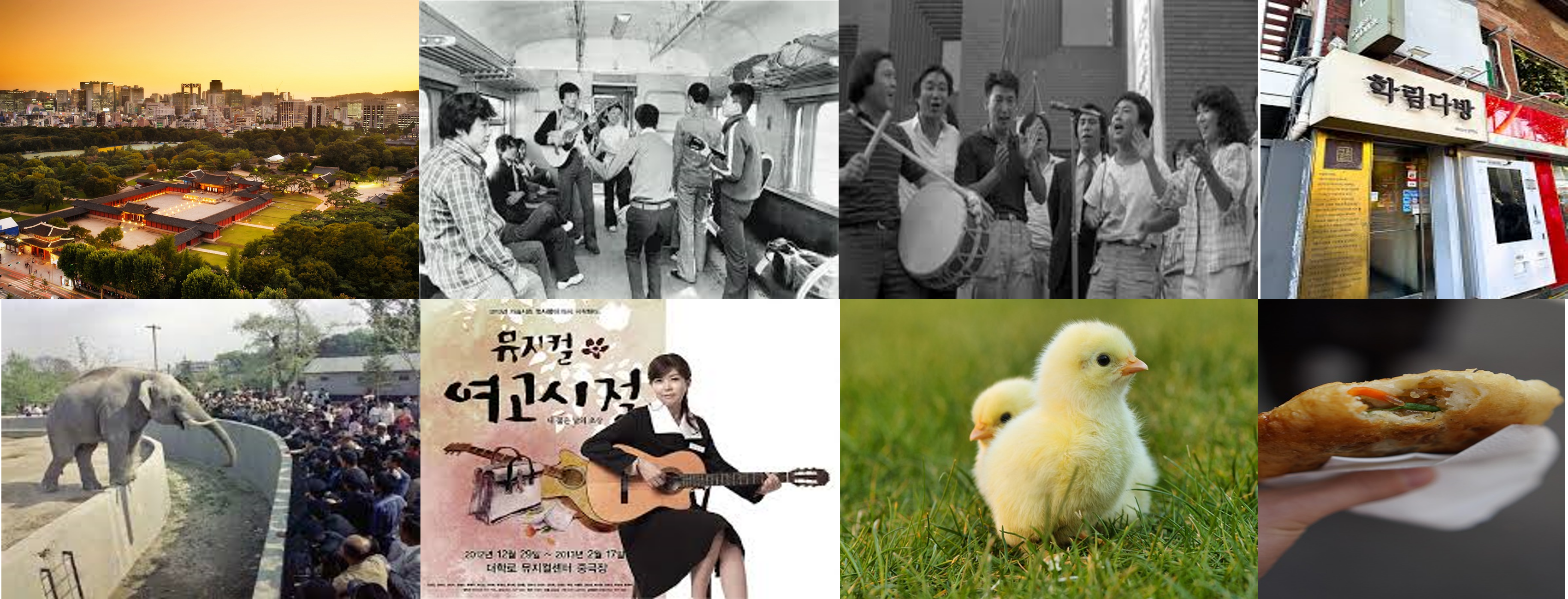 광화문쪽으로 조금 더가면 창경궁, 일본이 식민지배하던 시절에는 궁에다가 코끼리 등 동물들을 넣어놓고 창경원이라 동물원을 만들었던 곳도 있었습니다. 그 옆자락으로 가면 근처에 성균관대학교와 젊음의 거리 대학로가 있습니다. 많은 공연장과 거리공연, 지금은 성공한 가수와 연예인도 많지만 거의 모두가 혜화동 출신이라고 해도 과언이 아닐 정도로 평일이어도 주말이어도 젊음이 넘치던 거리였습니다. 한 때는 차없는 거리로 긴 4차선 도로에 삼삼오오 친구들끼리 않아 기타를 치고 노래를 하고 거리공연을 보거나 막걸리 한잔을 하던 곳이었습니다. 이곳에서 대충 많이 먹었다 싶을때는 시청근처로 옮겨 당시 "코러스" 라고 하던 지금으로서는 음악카페로 자리를 옮겼습니다. 음악을 노래를 좋아하는 학생들만 입장이 된터라 술은 팔지 않았고 기본이 음료수 한잔 1000원~2500원에 교과서(노래책) 한권. 노래를 좋아하고 교회를 다니고 등등 재능이 있는 대학생들이 자리를 꽉채워 노래책을 피아노 연주자이자 사회자가 개그를 섞어 인도할 때면 코러스가 된 정말 감동적인 노래들이 건물 밖으로 퍼저 나갔습니다. 연주자의 설명을 듣자면 그곳은 초년생 가수들이 거쳐가는 곳으로 양희은씨나 통기타 가수들이 모두 올랐던 무대라고들 했습니다.